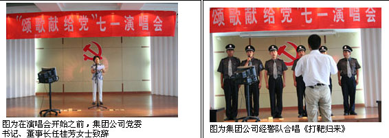 2007年6月30日,為了慶祝中國共產(chǎn)黨建黨86周年,集團公司黨委在五樓多功能廳組織了“頌歌獻給黨 七一演唱會(huì )”。集團公司全體黨員、行管人員、班組長(cháng)以上干部參加了活動(dòng)。在演唱會(huì )即將結束時(shí),全體參會(huì )人員一起高歌《沒(méi)有共產(chǎn)黨就沒(méi)有新中國》將演唱會(huì )推向高潮,全體黨員干部將真抓實(shí)干,為完成2007年度公司各項經(jīng)濟指標而努力奮斗,為黨的十七大獻禮。