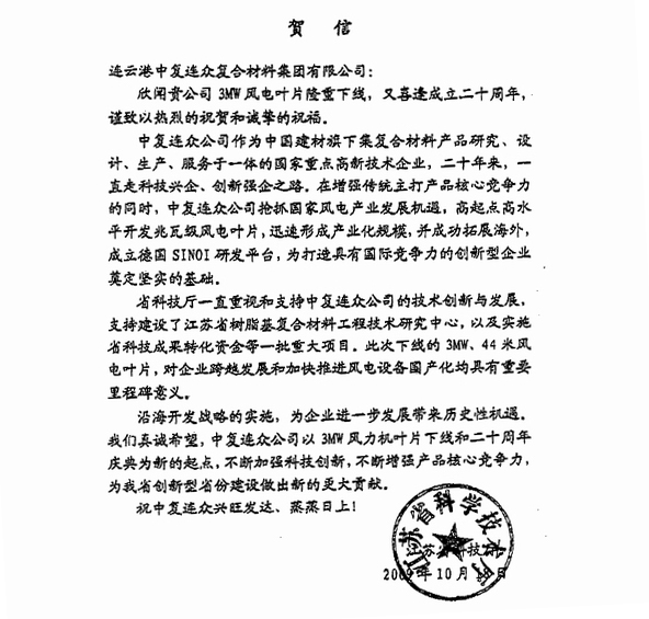 金秋十月,恰逢中復連眾3.0MW風(fēng)力機葉片暨二十周年。近日來(lái),江蘇省科技廳、甘肅酒泉肅州區委區政府、巨石集團等單位發(fā)來(lái)賀信,對中復連眾表示祝賀。