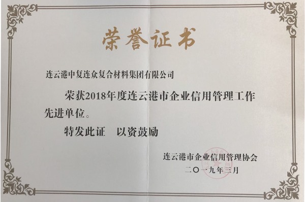 3月21日,連云港市企業(yè)信用管理協(xié)會(huì )對榮獲2018年度市級“信用管理先進(jìn)單位”進(jìn)行表彰并舉行授牌儀式,中復連眾榜上有名。